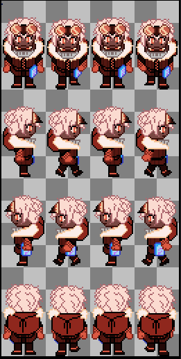Hier sind die Sprite sheets des Charakters. Erstellt in Aseprite, einmal der Walking cycle in 4 Richtungen und einmal in zwei Richtungen die Attacke.